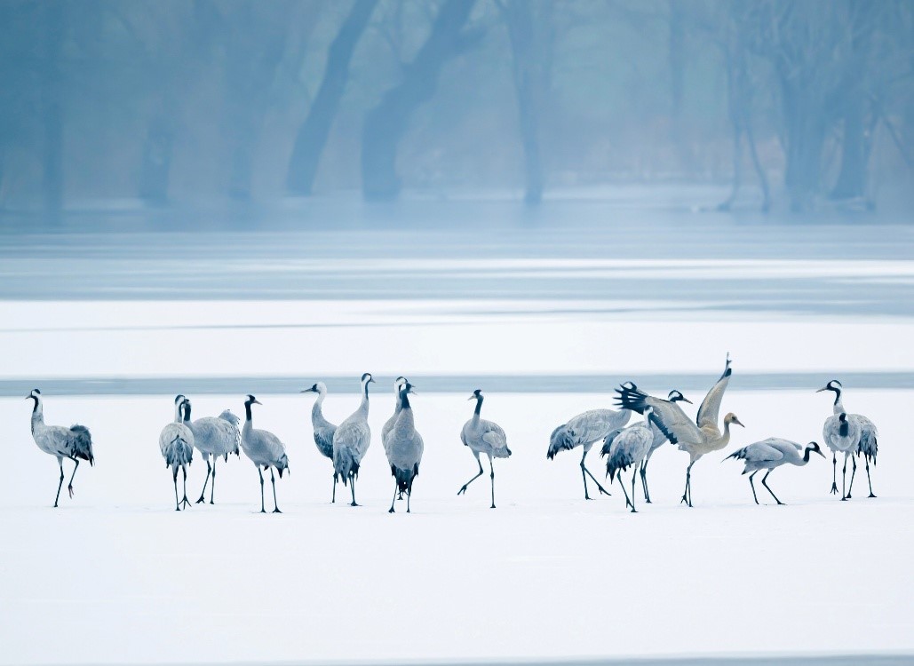 източник на снимката: © Jiang Jingsheng, сиви жерави спрели за почивка в язовир Tangzhishan, област Шуни, Пекин